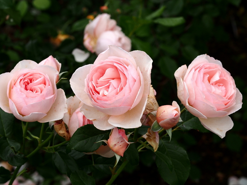 薔薇 ヘリテージ。 三個並んで皆、綺麗に別方向を向く気難しやさん(^^)