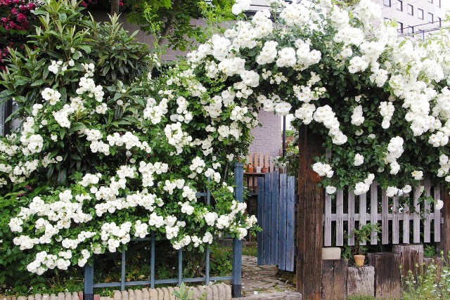 下から上まで全体に花がたくさん咲いて、選定や誘引がとてもお上手なのだろうと感心いたします。なかなか思うようにいかず、試行錯誤しています。