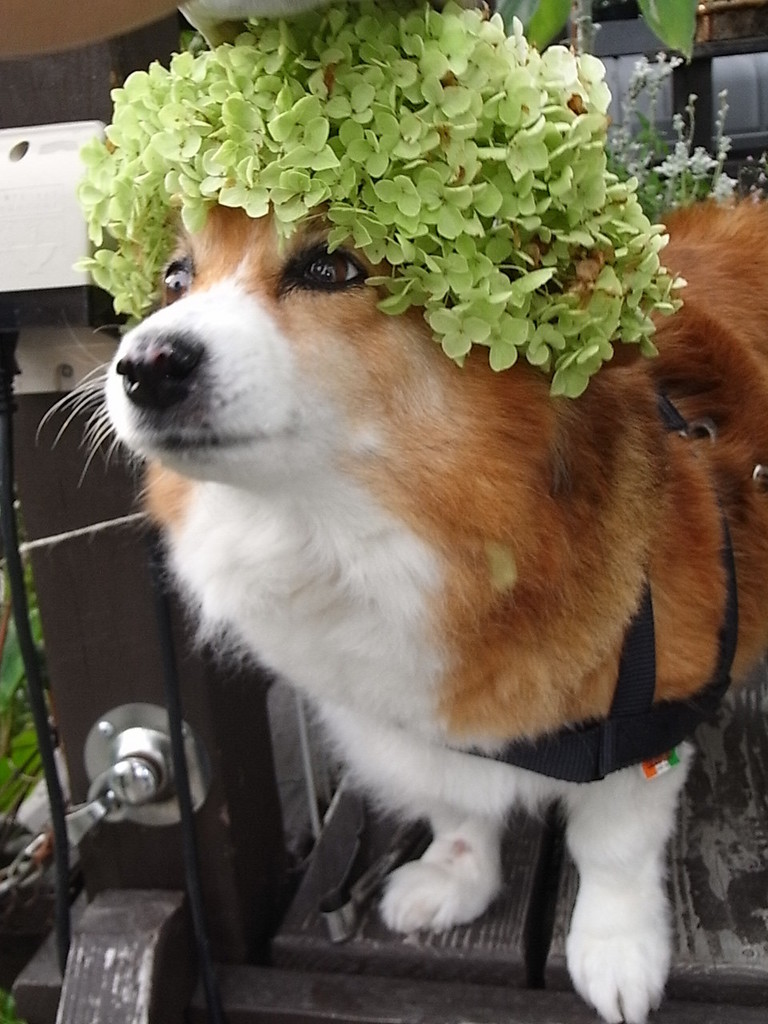 わぁ~似合いすぎ~!アナベルかな?ちっとも嫌がらず、得意満面なところがさすが元祖庭犬さんです。