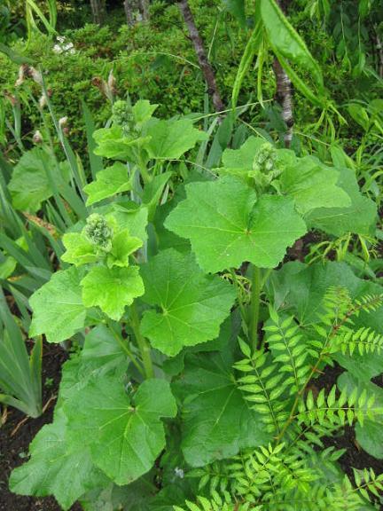 渋色系のホリホックのツボミ、お隣は山から採ってきた山椒の木です。