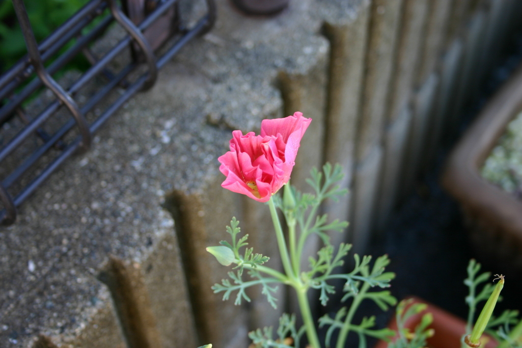 ピンクのハナビシソウです。一重の花びらは、細やかなフリンジが入り、ピンクからオレンジへの光るグラデーションとなってます。