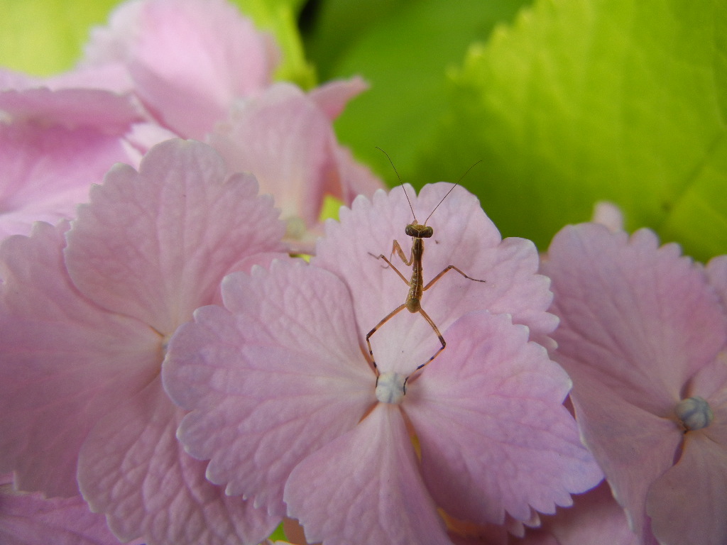 アジサイの花が、とても大きく見えるほどの可愛さ^^ 小さくても一人前の姿ですね。