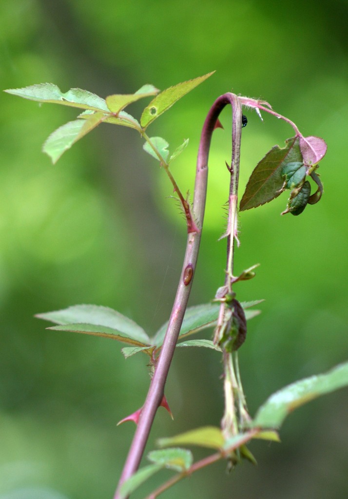 前の写真の巣箱の横に写っているポールズヒマラヤンムスクの新枝が、数時間後にはこんな状態になっていたのでよく見てみたら、バラゾウムシがついていました。今年は特に被害が多く、一番花のほとんどがやられました。