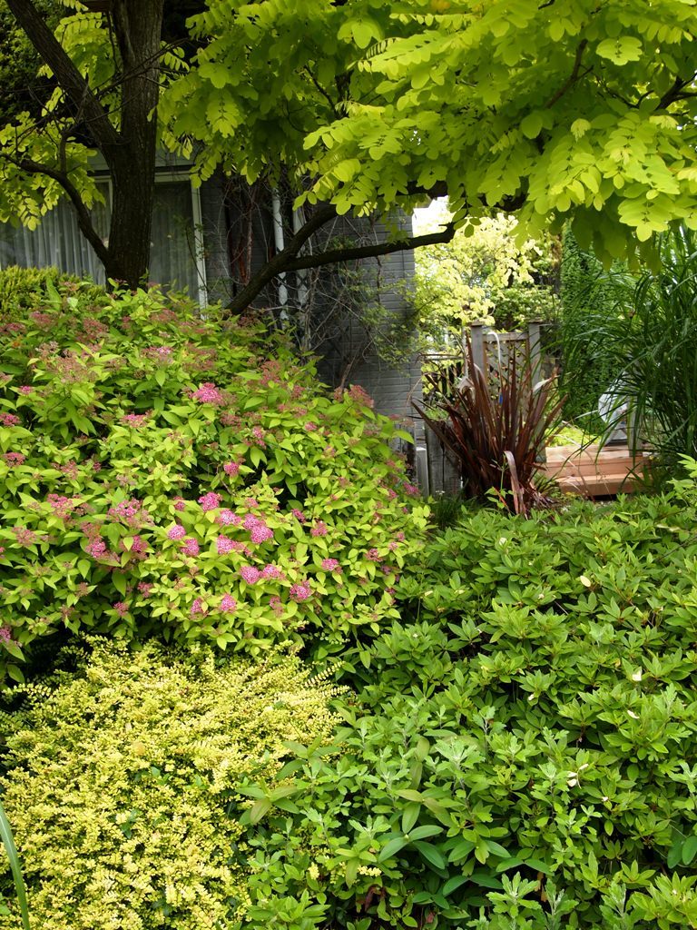 黄金シモツケのピンクの花が良いアクセントに。