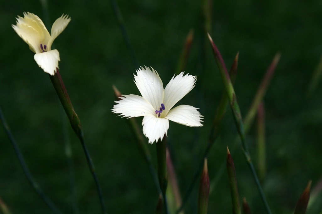 これは手に入れたばかりのナデシコの変わり種。薄いベージュ色で中心のシベが濃い紫でとっても素敵な彩りです。