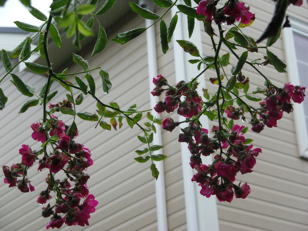 写真も車庫の屋根の下から、隣の建物をバックに。品種はノバラの色変わりらしいと分かりました。どおりで丈夫!