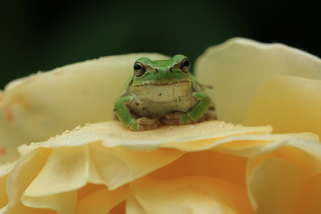 どのカエルさんもいい顔してますね~(*^^*) この後、花の中にもぐったのかな~。雨をよけて?賢いですね。