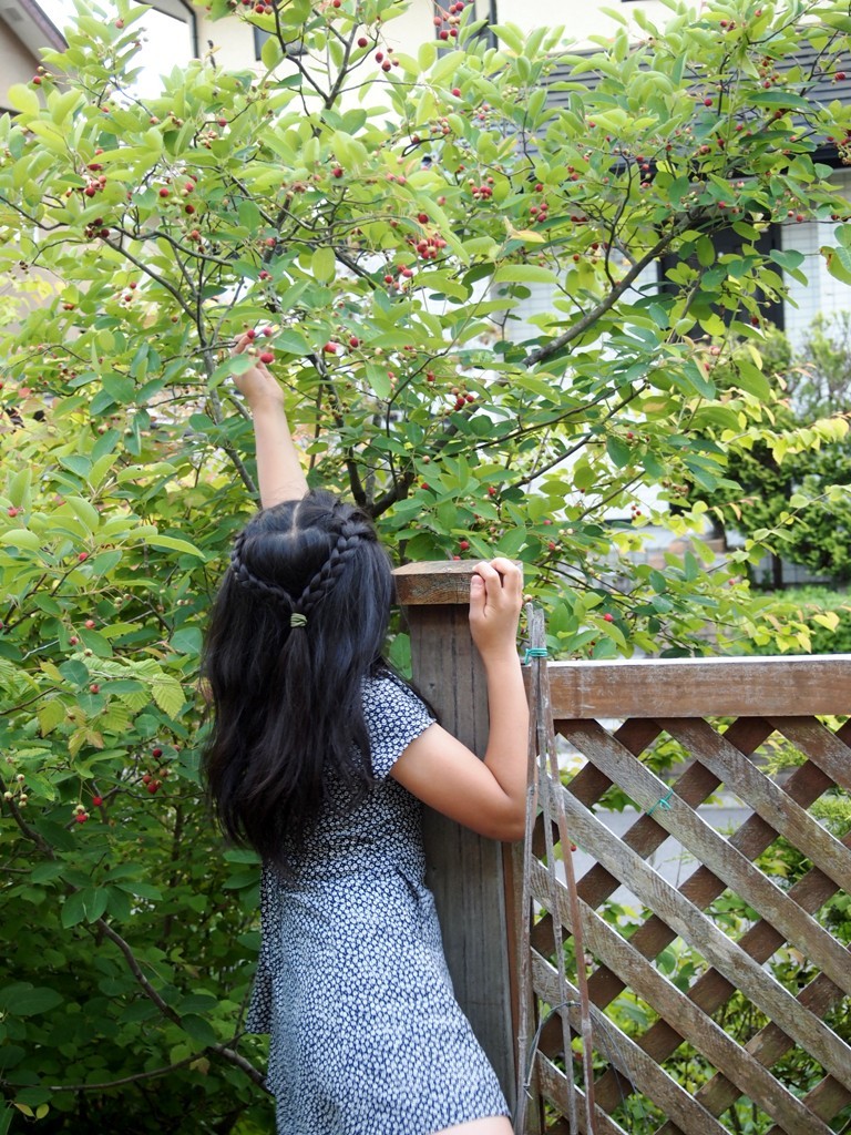 可愛らしい後ろ姿のお嬢さんですね!ワンピースも素敵!私の娘たちもベリー系はまだ熟していないうちからすぐに食べてしまいます。小鳥が早いか娘が早いか・・・です。
