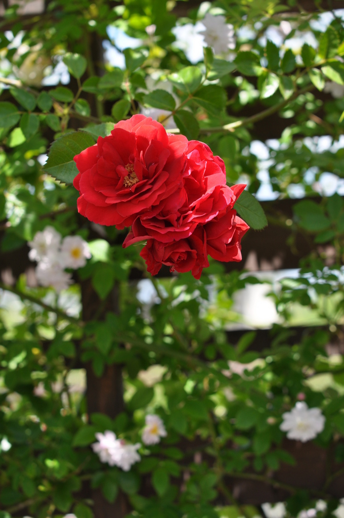 背景の白いお花が赤いバラを引き立てていて素敵な写真ですね♪