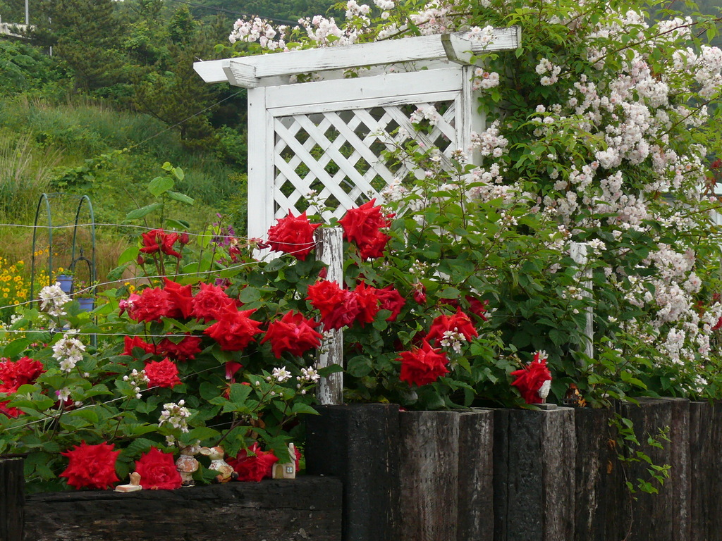 赤いバラの効果、こんな風に使うと良いのですね。ヒマラヤン・ムスクもノビノビとしてバラの性質を生かした風景で素晴らしいです!!