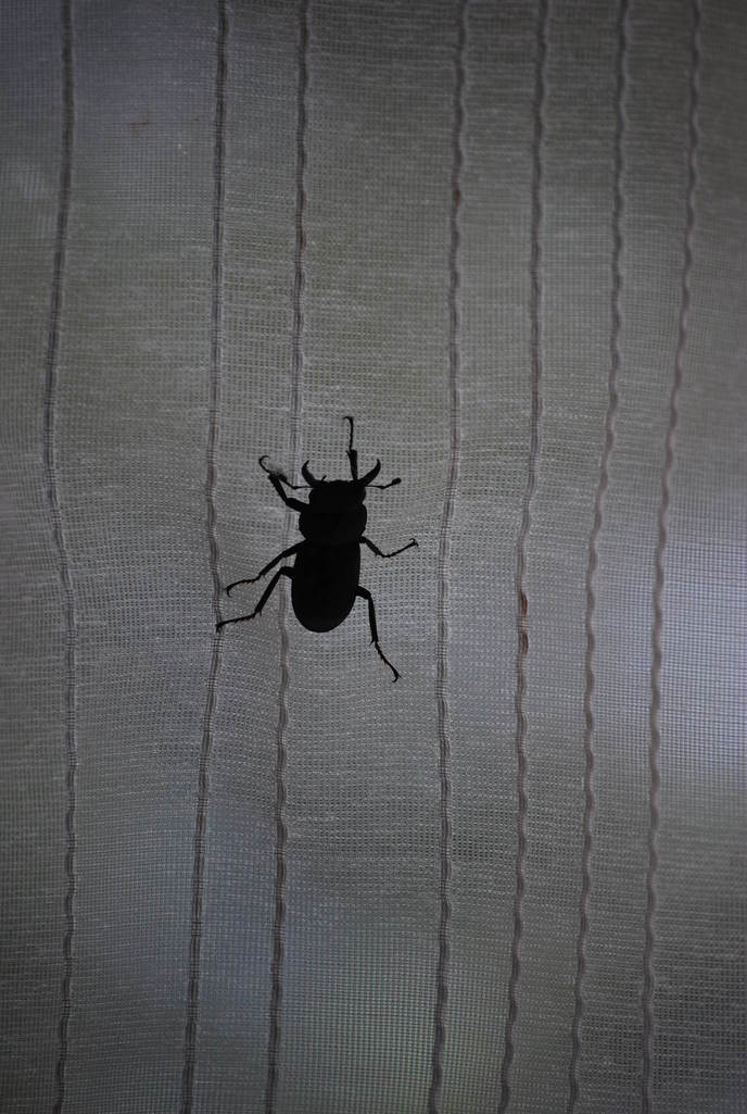 コクワガタがカーテンに!なぜ!ここにいるの? 今夜はお花畑でホタルが飛んでいたし!虫が身近にいっぱいいる所で育った息子なのに虫大の苦手なんです。