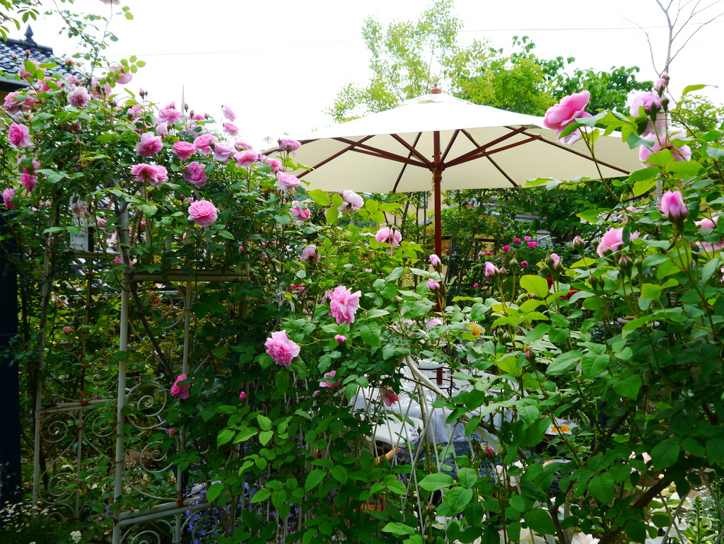 ピンクのバラたちに囲まれて、このパラソルの下でゆったり過ごしたら、素敵な時間が過ごせそうですね。