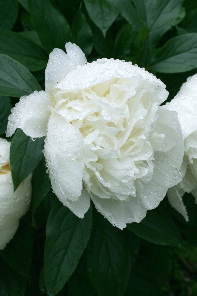 もうおなじみのシャクヤクです。真っ白な花びらいっぱいに水滴をまとってとっても素敵です。でももうそろそろ美しさのピークです。
