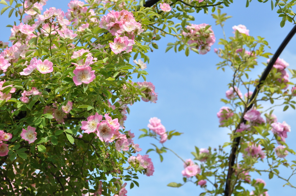 澄んだ空のブルーとかわいいバラのピンクがとっても素敵です♪明日はこちらも晴れるかな~