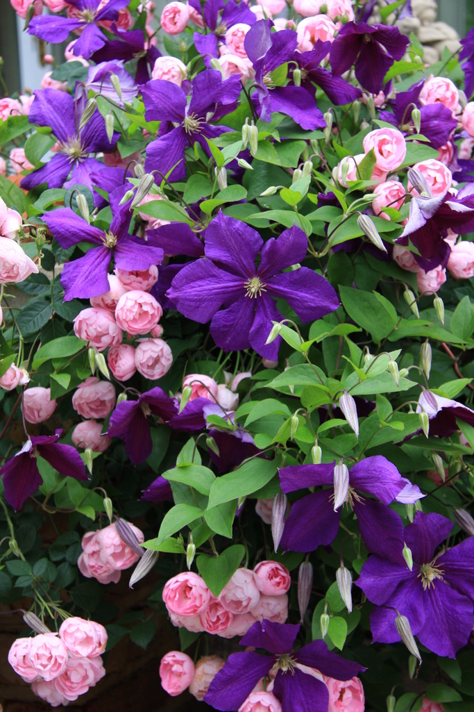 薔薇からクレマチスに時間差でチェンジ、写真はローブリッターとジャクマーニー