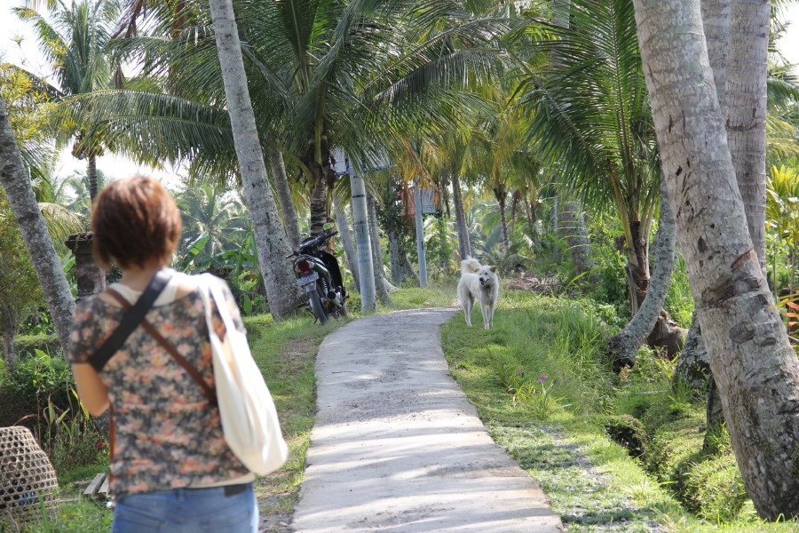 数分歩くと、田園風景が広がってきましたが、現地の人のバイク以外は誰も歩いていません(^^;;ガイドブックもないので、ウロウロ付いてきてくれるワンちゃんに、行き先を告げました。そしたら、先を歩いては、振り返り、付いておいでと言ってるみたい…(^o^)これから、この子は30分も私達を誘導してくれました。