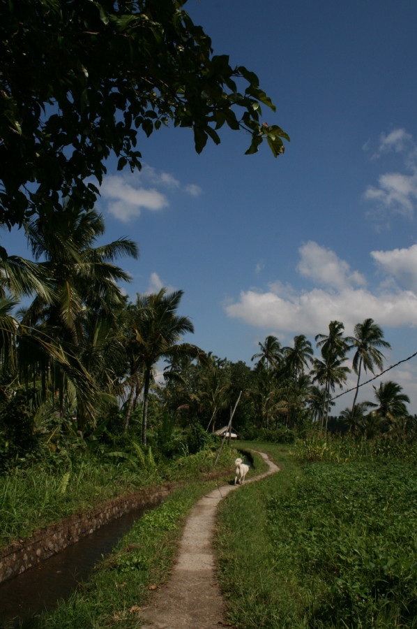 森の中を、ワンコと私達親娘、のんびり景色を歩きます。この白いワンちゃんはレストランのあたりまで、付いて来てくれました。なんか不思議な体験です。バリのワンちゃんは、つながれてません。それに、どのワンちゃんも吠えません。みんないい子でした。
