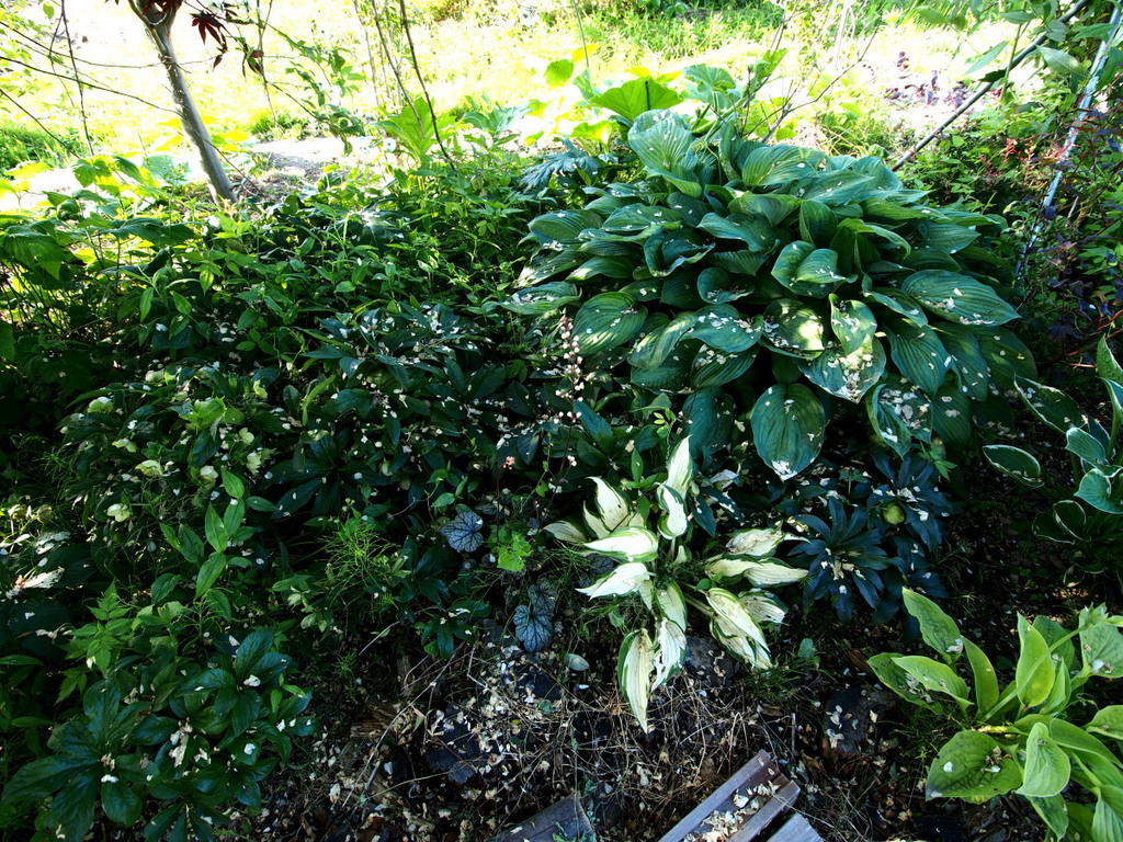 ホスタ、クリロ、アカンサスモリス等々…、何が何やら(^_^;) 白の点々は上から降ってきた薔薇の花びら(^_^;) この一帯はもう手に負えません(^_^;)