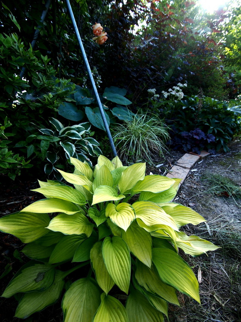 緑一色の中にポツンと黄色のホスタ。 なかなか良い光景です(^^) このホスタは強光にも耐え、むしろ強光下の方がより黄色になってくれます。