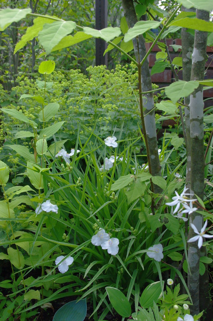 容姿の異なるカラーリーフの中で存在感がある可愛い白花ですね。とても素敵な空間ですね。