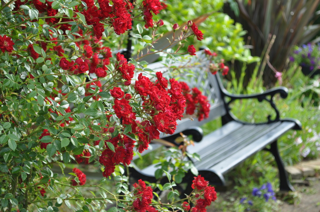 赤のつるバラが欲しくて今回購入しました^^ 小輪でも色がインパクトがあるから目をひきますね。 安曇野は一番最初に購入したものでもう7.8年になると思います。 ぼうぼうに伸び放題ですが、そのぼうぼうがいいみたい(^_-)-☆