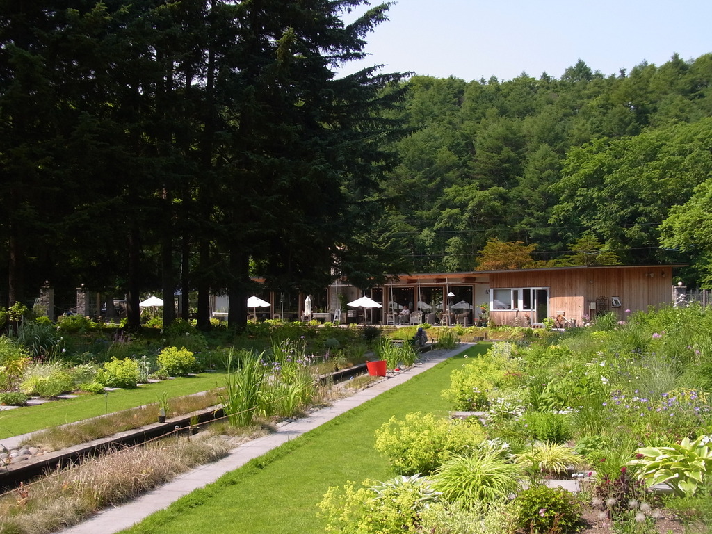 広大な敷地に配された木々と店舗棟。贅沢な空間が広がります。
