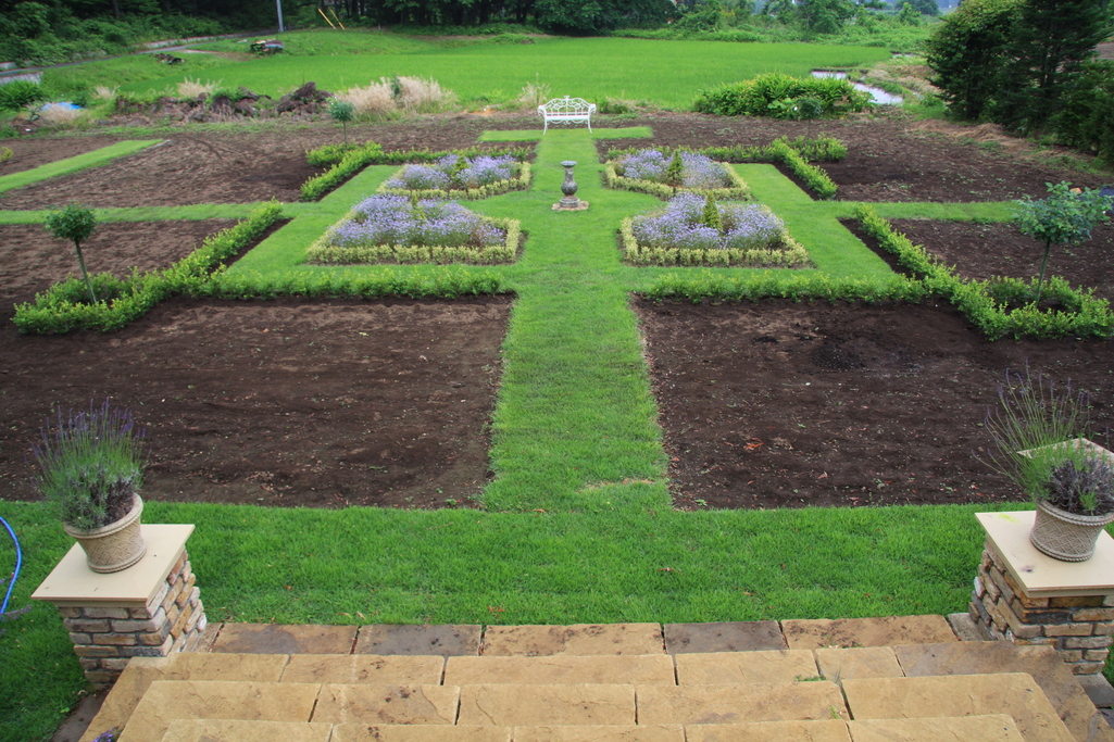 POIROTさん、お尋ねのボツクスですが今回植えたものは、普通のボックスウッドですが、中の黄緑のものは斑入りの葉をもつエレガンテシマという名のイギリスでよく使われているものです。この斑入りのボックスは冬でも色は変わりませんが、普通のものは冬は茶色に変色します。この色の変化を考え植え付けをしました。