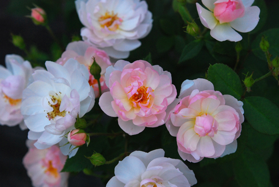 可愛らしいバラで、私も植えています。今は2番花たちもちょっと雨にやられてかわいそうです。傘をさしていますけど・・