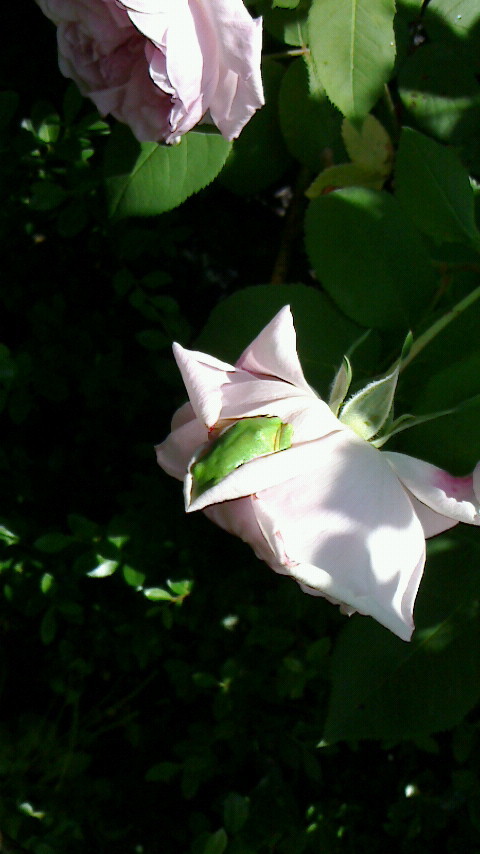 なんて幸せなカエルさんなのでしょう!薔薇につつまれてバク睡ですね^^