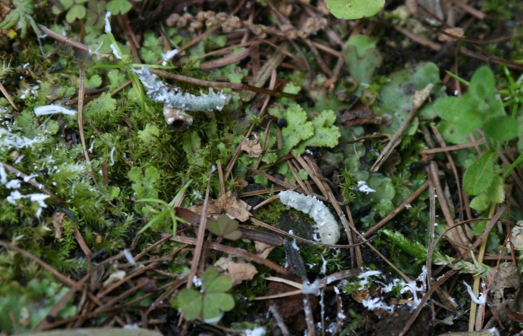 白いふわふわしたのを落としてみると、中にこんな青虫が隠れていました。調べてみたら白い綿毛は蝋みたいなものらしく、ミツクリハバチというハバチの幼虫のようでした。