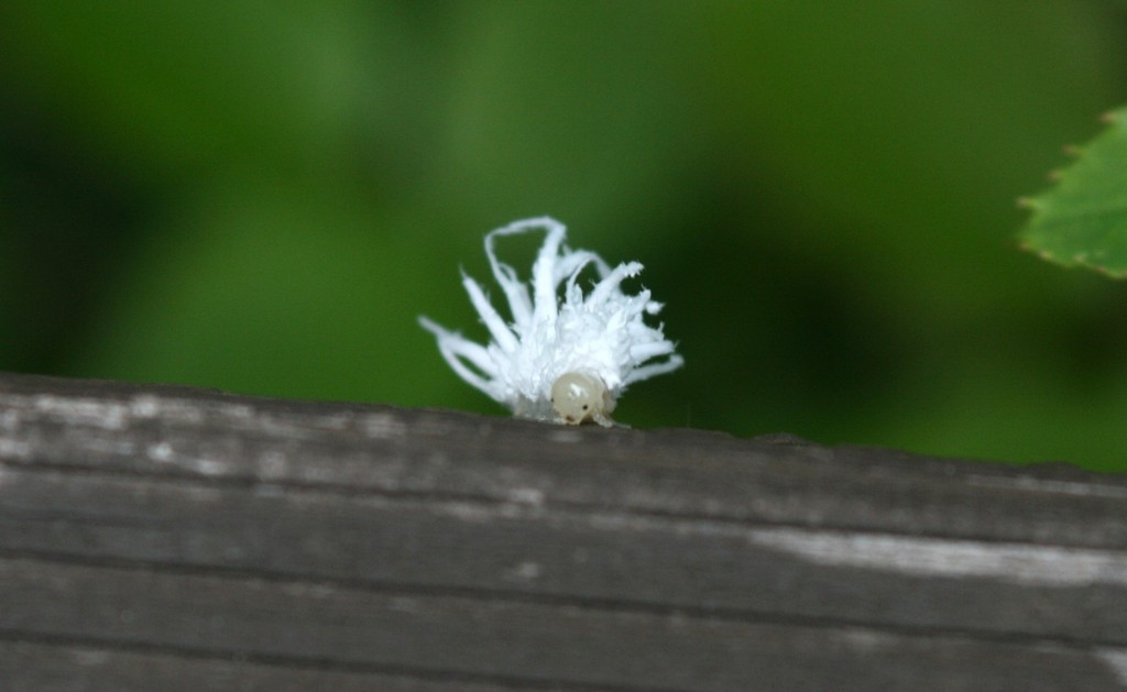 昨日紹介したミツクリハバチの幼虫。正面から見るととっても可愛いお顔です。背中全体に乗せている真っ白の綿毛は、体から分泌する蝋でできているそうです。