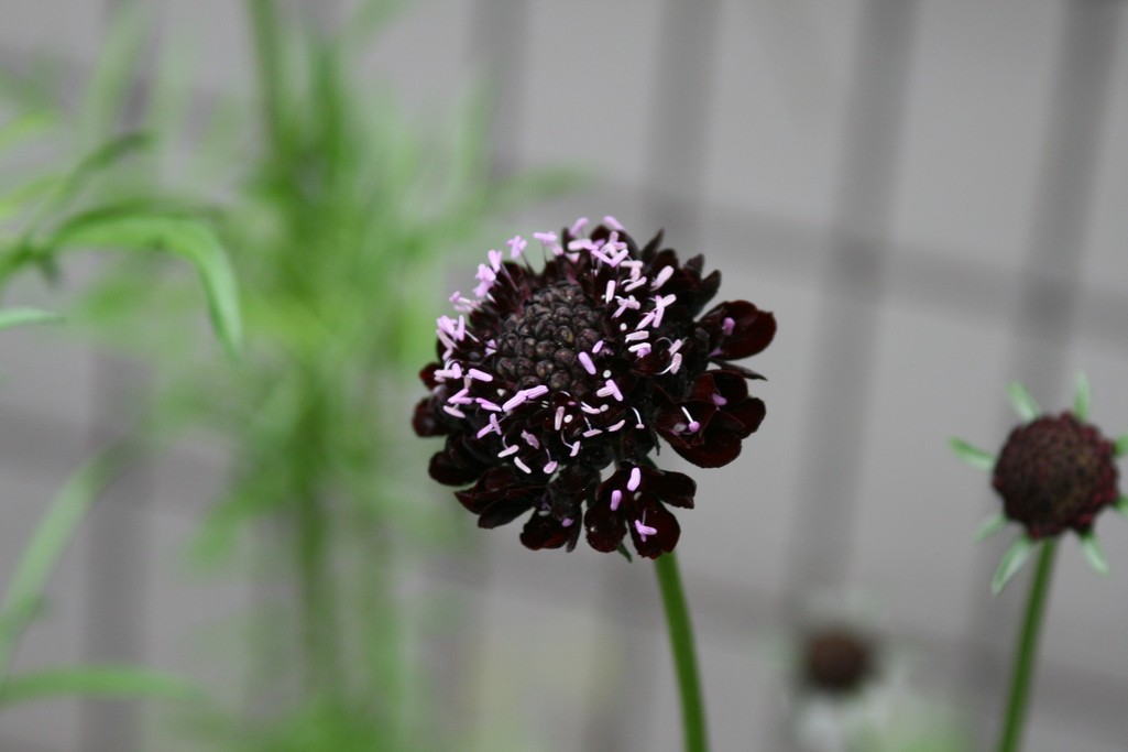 ほとんど黒に近いビロード色のスカビオサ。やっと一番花が開きました。