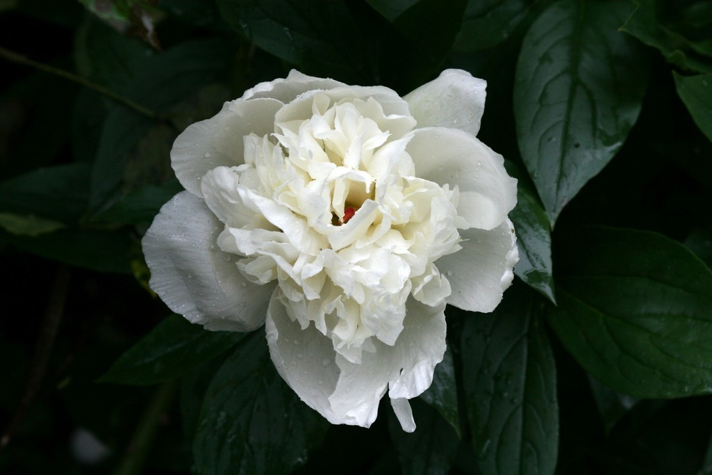 満開のアイスバーグの足元で、負けじと真っ白なシャクヤクが脇芽の最後の花を咲かせています。