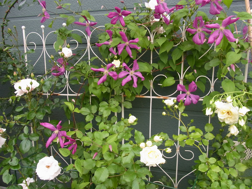 ニュードーン、バニラボニカ、クレマチス。3つとも大きく育って来ました。