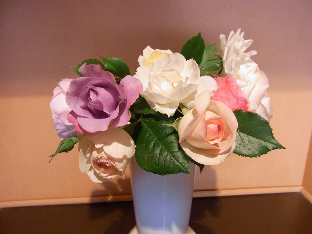 その日咲いているバラを集めて。この日は母からもらった「パープルメモリーズ」(名前不明のため、勝手に命名)も飾っていました。このバラを見ては、母を偲びます。