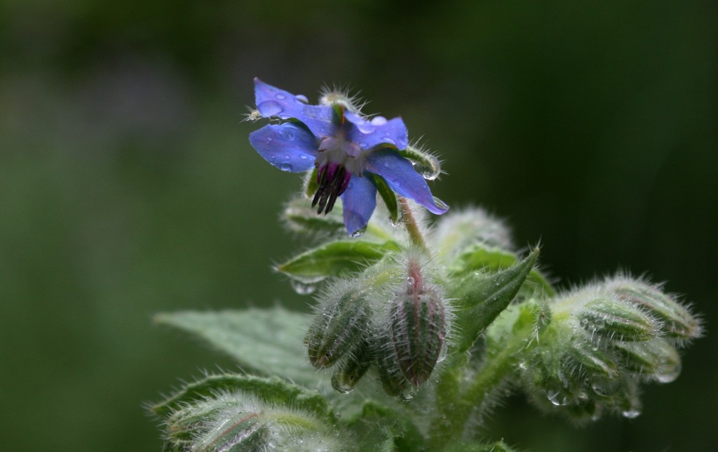 これは去年のこぼれ種から芽を出したボリジ。やっと花芽が膨らみ最初の花が咲きました。この薄いブルーはたまりません。