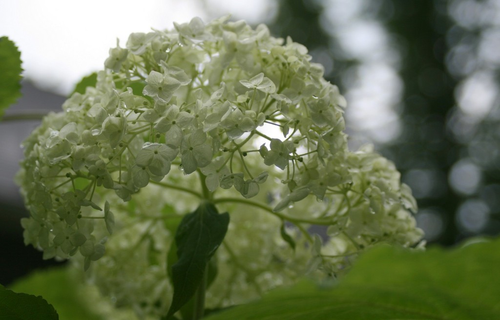 全体に白く色づいてきたアナベルを下から透かして見たところです。