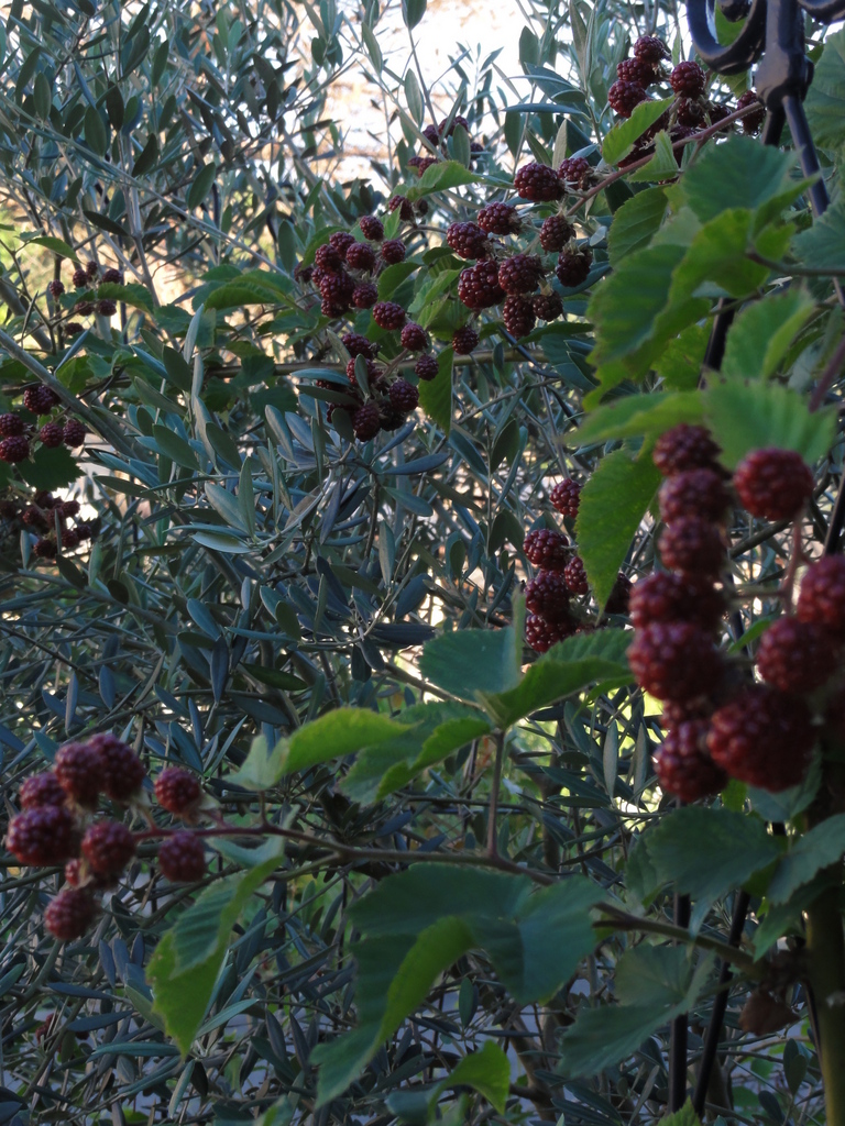 オリーブの銀葉にブラックベリーの渋い臙脂の実が合いますね。ポチ