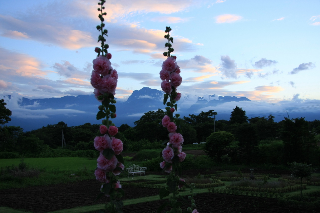 3メートルの素敵なホリホックを見上げて・・・そして、その向こうの南アルプスの山並みを見つめたいです(笑顔)