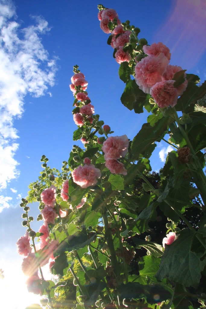 すごい迫力ですね。青空に向かってグングン伸びるホリホック。花にも幸せってあるのですね。