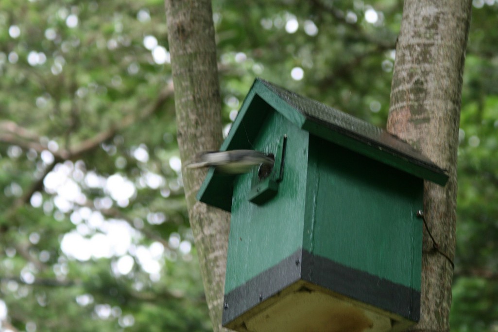 今年の6月に新しく架け替えた巣箱で、いつものシジュウカラ夫妻が今年2度目の子育てを始めています。これはエサを運んできた後に、糞を咥えて飛び出す瞬間の親鳥です。