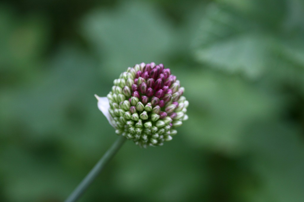 これは今年初めて植えたアリューム。背丈は1m近くあってまるでネギ坊主の様な感じですが、薄い被膜がはがれるとまるで丹頂鶴の頭のようにてっぺんが赤くなっています。