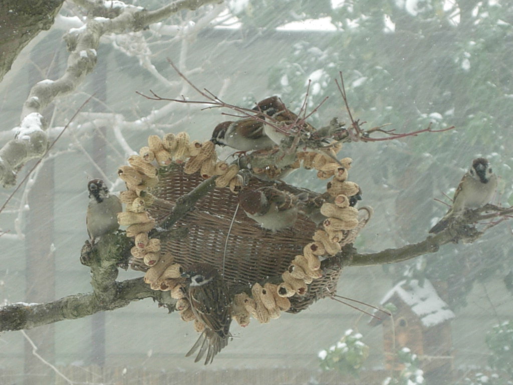 窓の外は寒そうだけど、こんな可愛らしい風景に心がポッと温かくなります。すずめさんなら我が家にも来るかなぁ?真似してみよう!