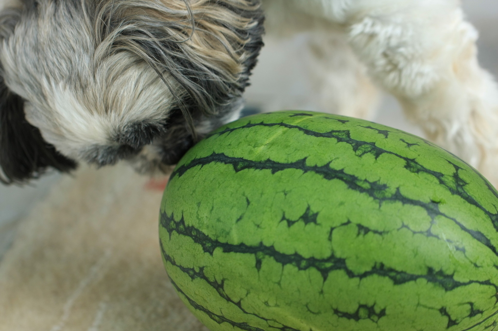 どうやって割ろうか悩んでるようですね^^ うちの子も、スイカは大好きです。皮ごとかじるので床には置いておけませ~ん(笑)