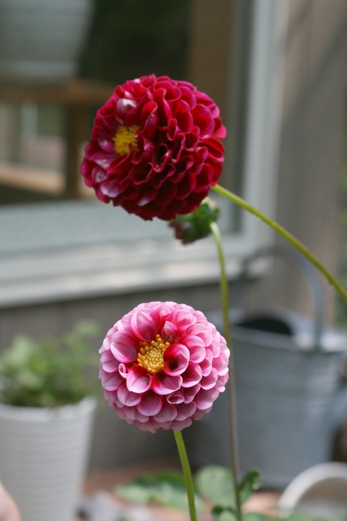 ダリア、可愛いです♬赤とピンクが同時に咲くなんて嬉しいですね。