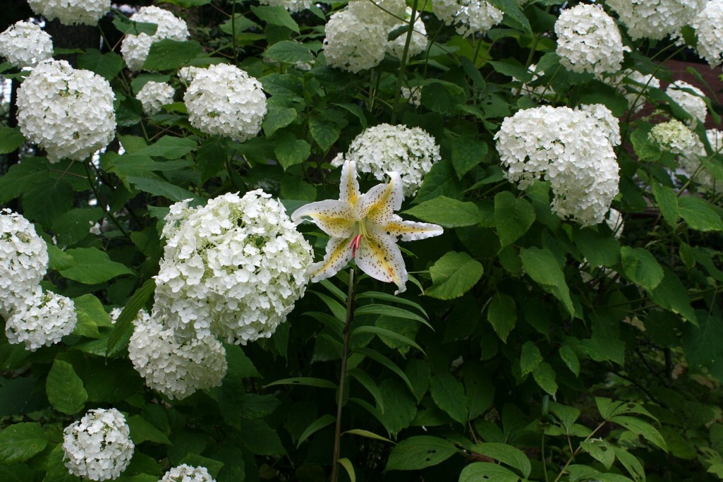 アナベルの中に迷い込んだ山百合、キレイですネ。今年は少ないですか?