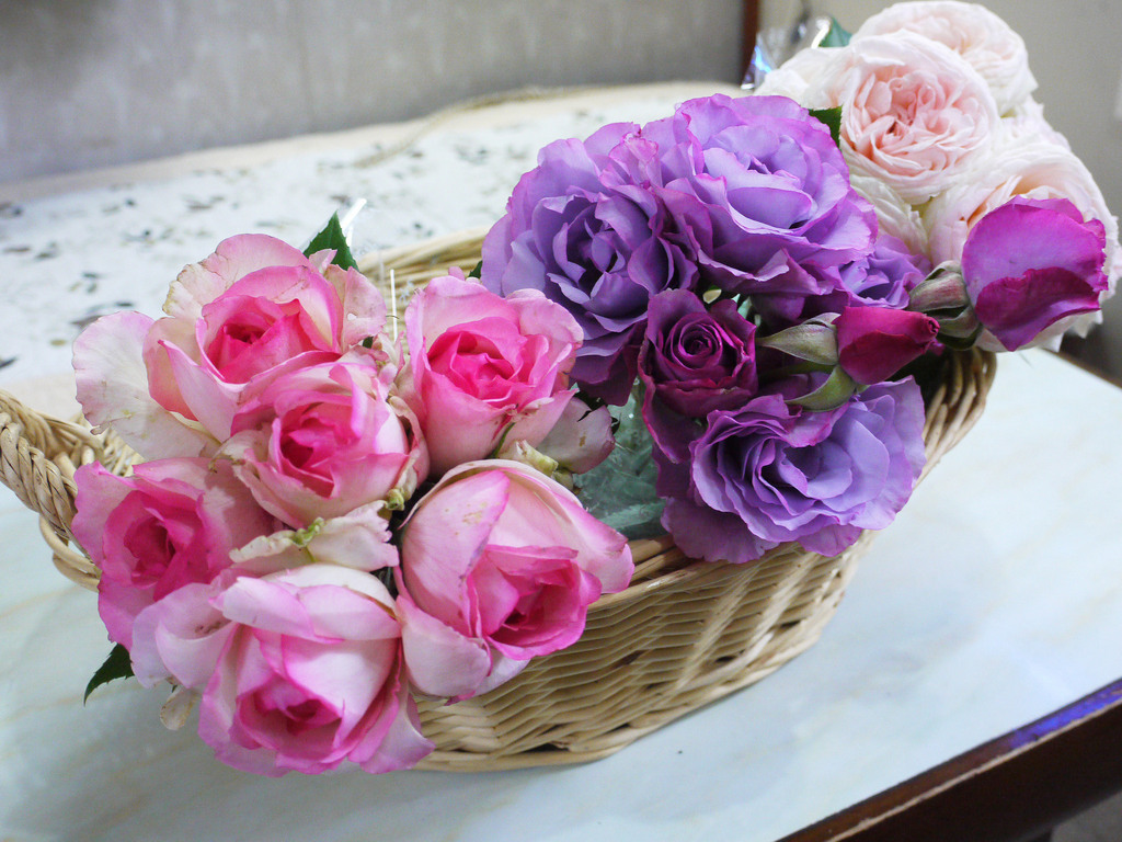 薔薇の花籠可愛いですね^^紫色がステキなアクセントになっていますね。