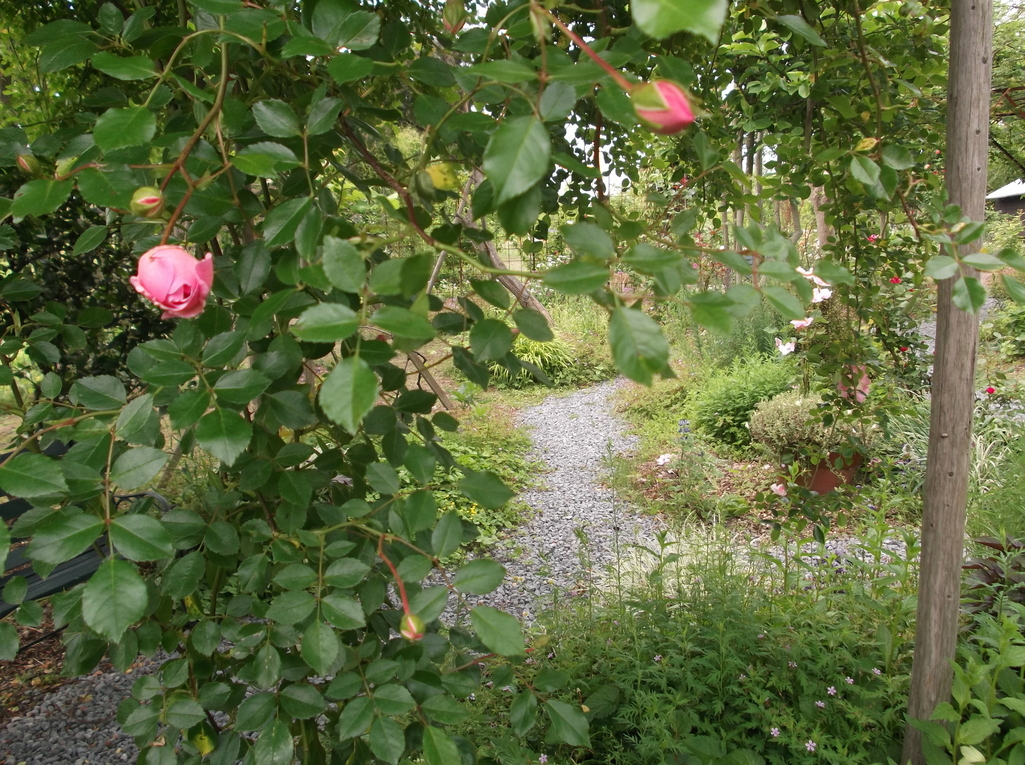 フランソワ・ジュランビルの枝が茂るパーゴラの下から外を見る。