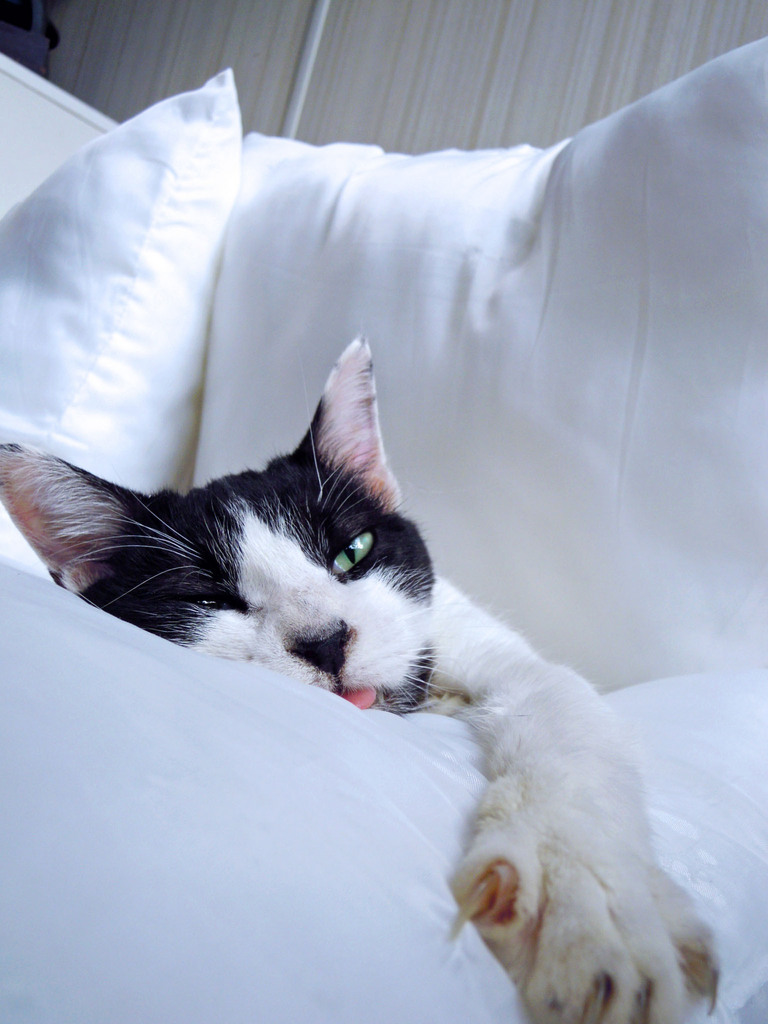 白いソファーがゆえに猫の毛色が映えますね。動物写真が得意ですね。