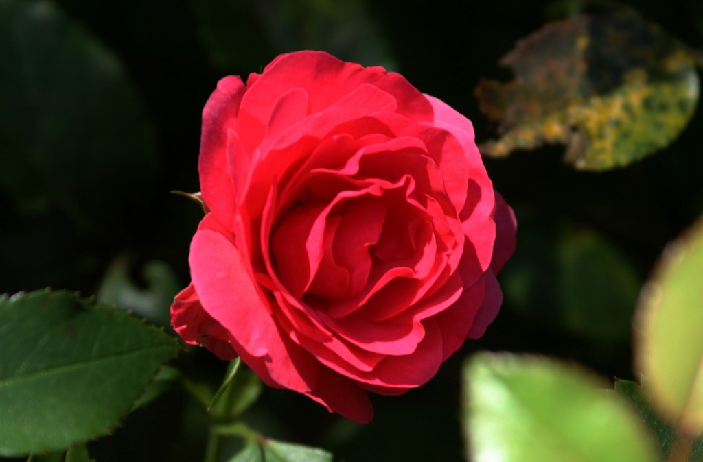 今一番元気なバラです。玄関脇の門柱の陰で沢山の花を咲かせています。蛍光ピンクの様な色が印象的です。